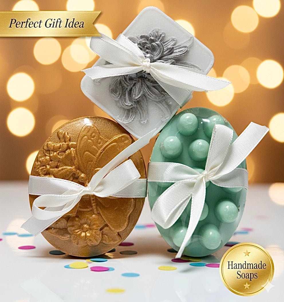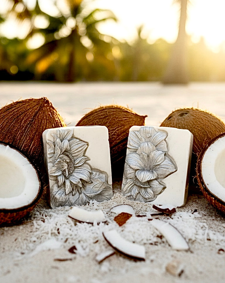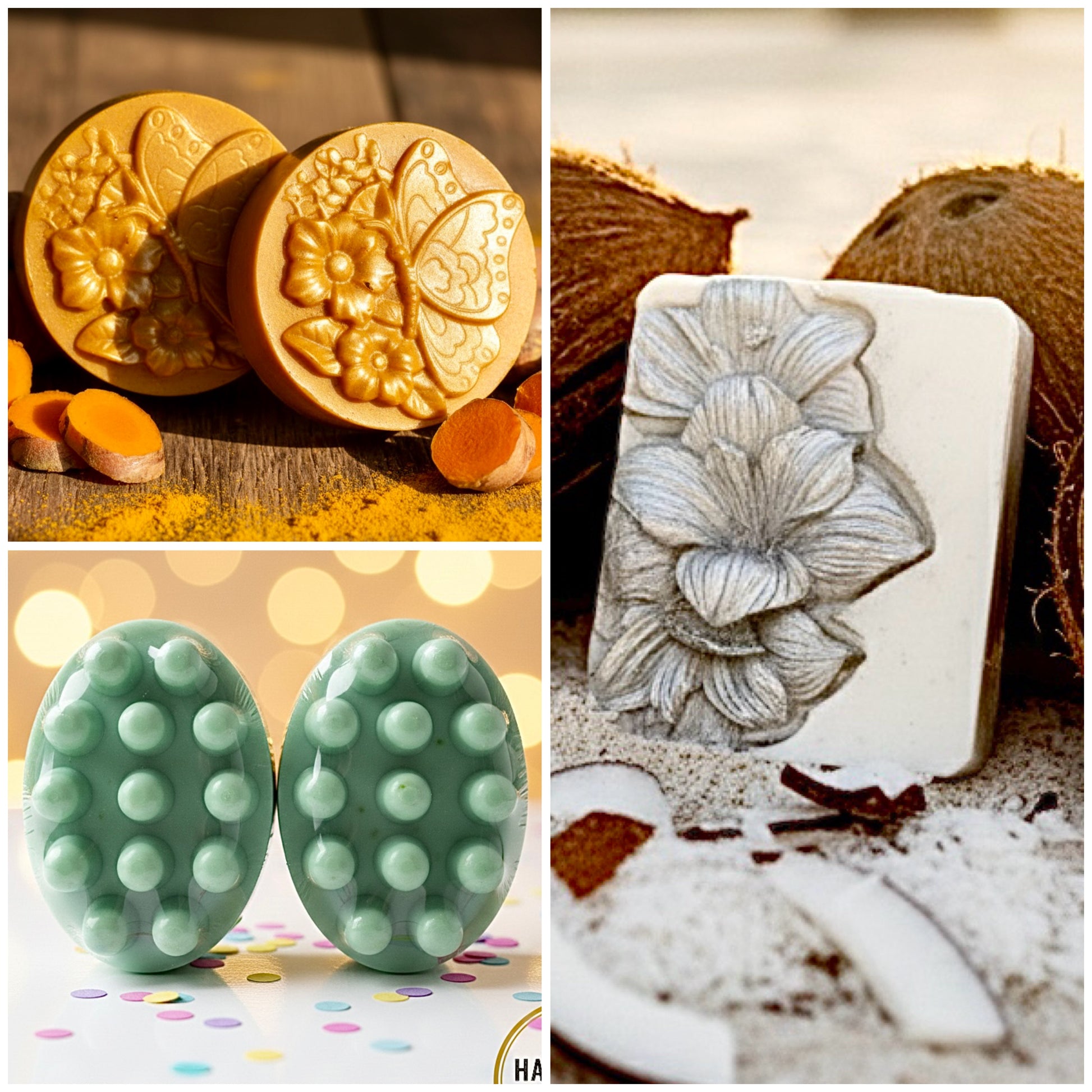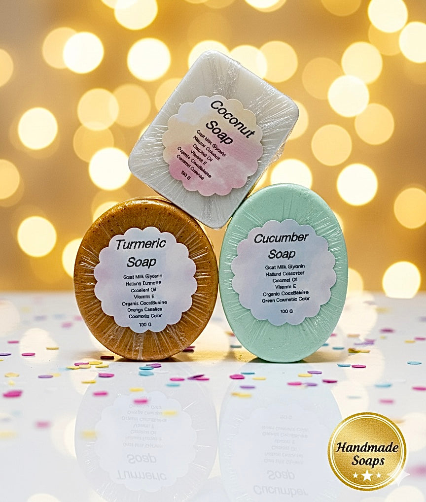 Set of Natural and Organic Handmade Soaps. Coconut Soap: Hydrates and Nourishes. Turmeric Soap: Eliminates Spots and Dark Areas. Cucumber Soap: Deeply Hydrates and Revitalizes Your Skin.