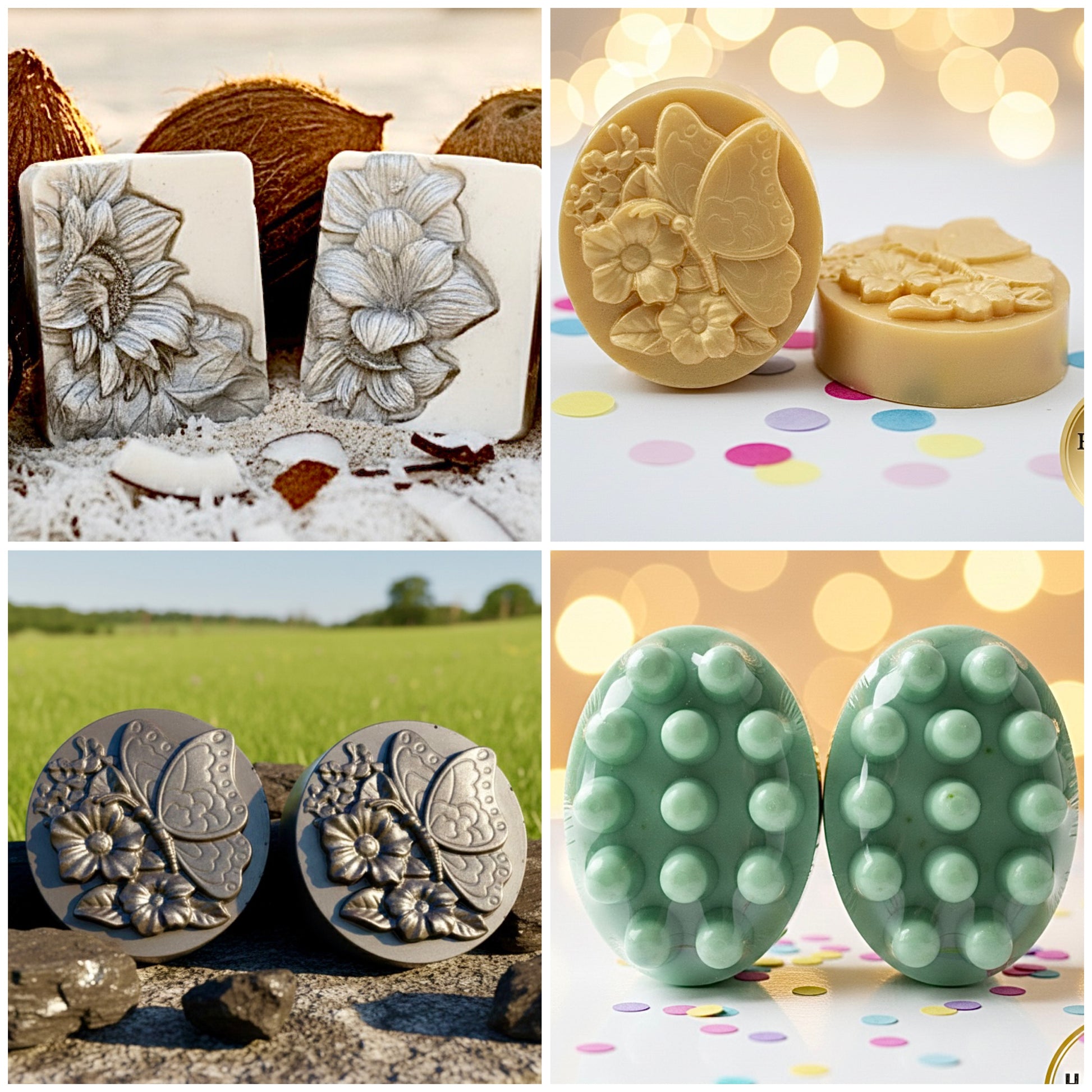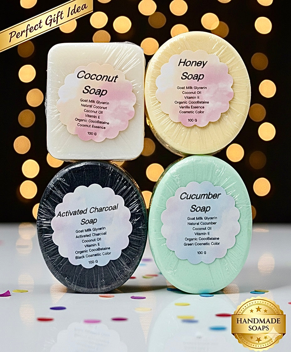 Set of Natural and Organic Handmade Soaps. Coconut Soap: Deeply Moisturizes. Honey Soap: Deeply Nourishes. Activated Charcoal Soap: Removes Blackheads and Excess Oil. Cucumber Soap: Deeply Refreshes and Softens Your Skin.