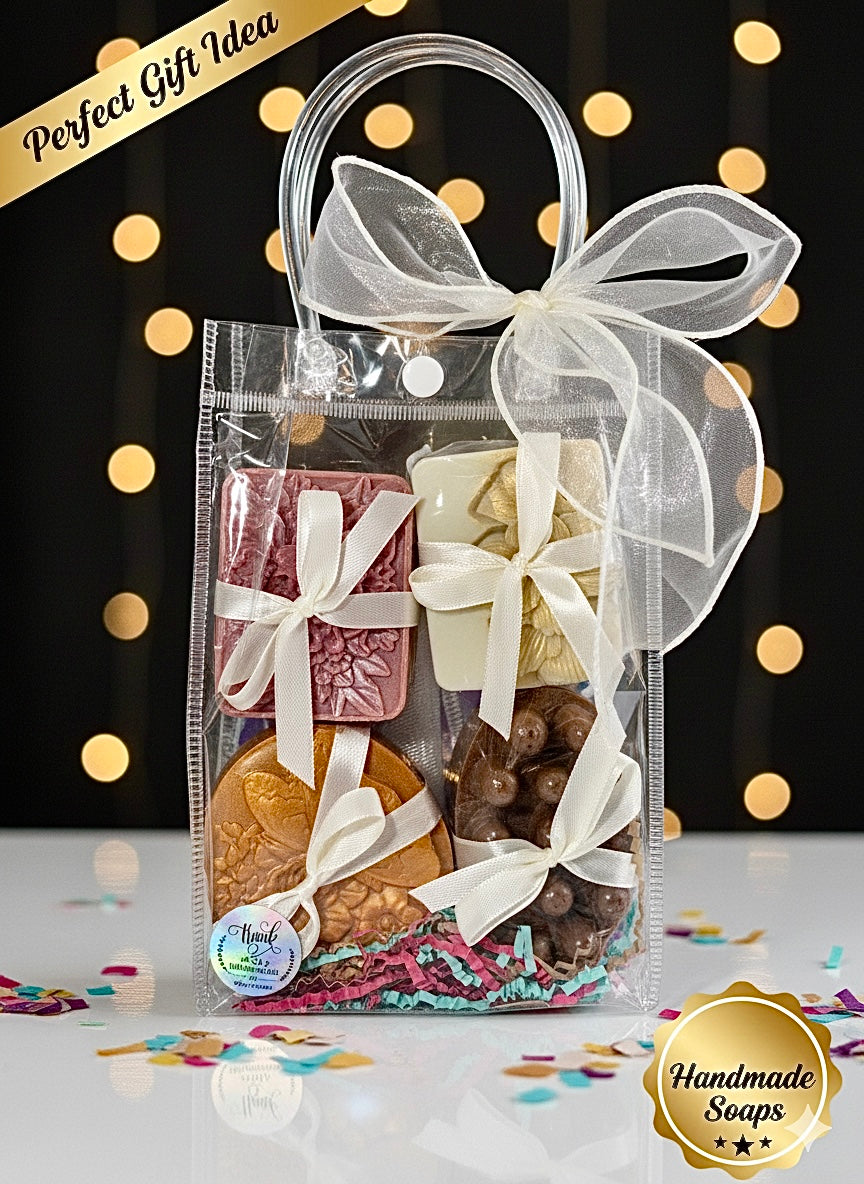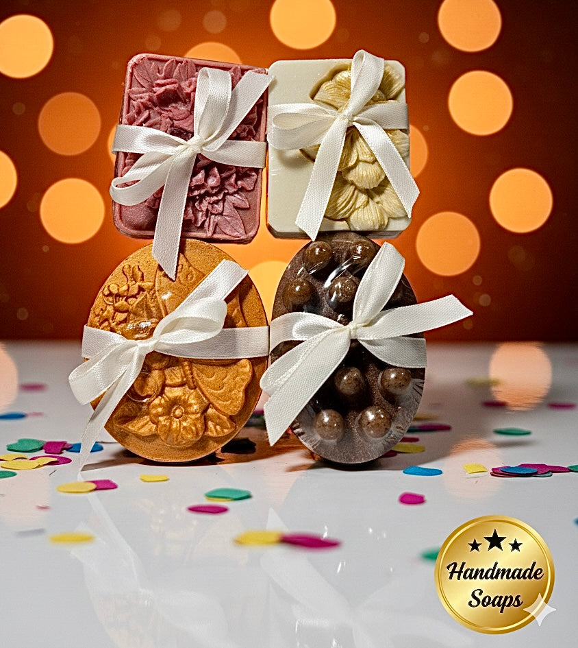 Set of Natural and Organic Handmade Soaps. Rose Soap: Deep Relaxation and Scent. Vanilla Soap: Warm and Enveloping Aroma. Turmeric Soap: Eliminates Spots and Dark Areas. Coffee Soap: Deep Exfoliation for Your Skin.
